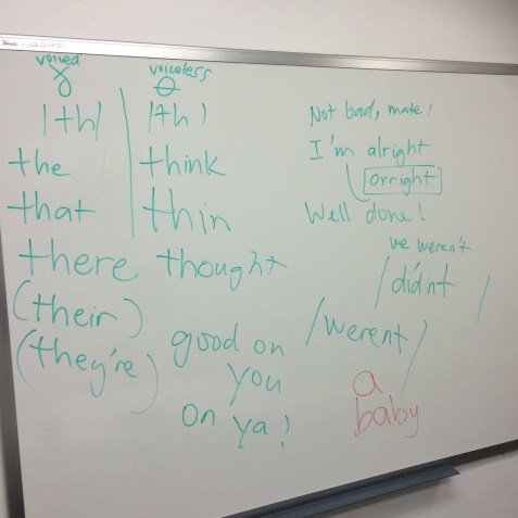Next up, 2 Accent Training clients who happen to work on one of the hardest sounds of English – the TH sound. It isn’t easy to place the tongue in between the teeth to make the sound, but we manage to say our words (e.g., the, think….) and even practice them in phrase and sentences. We also practice word, phrase and sentence stress at the conversation level. A Toobaloo, a mirror and a set of teeth are used regularly to give my clients auditory, visual and tactile feedback, assisting their pronunciation and helping them to articulate various sounds correctly and clearly.
